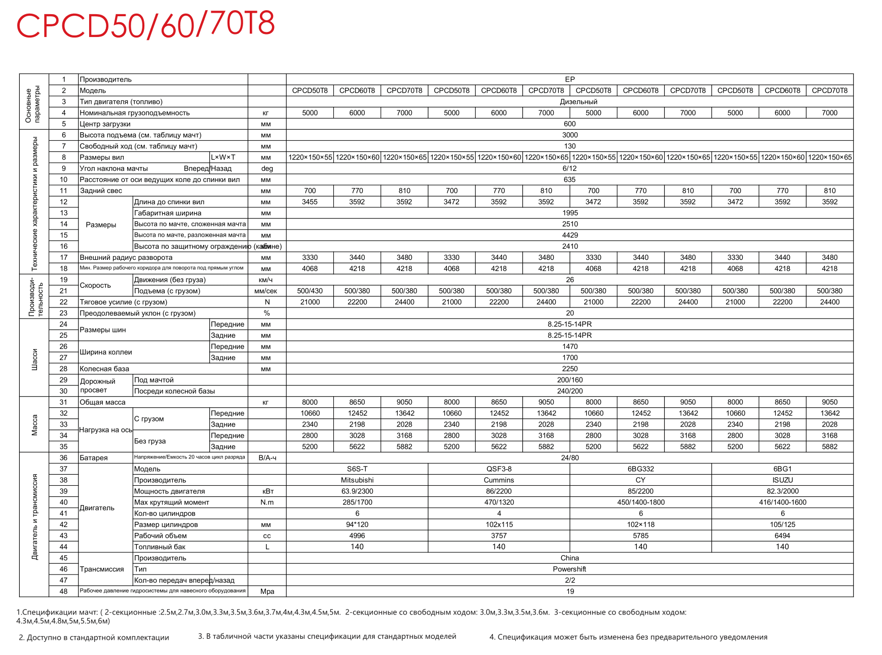 Точную комплектацию вилочного погрузчика уточняйте у нашего менеджера.Техника, может быть оснащена дополнительным оборудованием.Характеристики могут меняться в зависимости от комплектации.Вилочный погрузчик EP CPCD50T8 от EP Equipment – это мощное и надежное решение для складских операций и транспортировки грузов.
