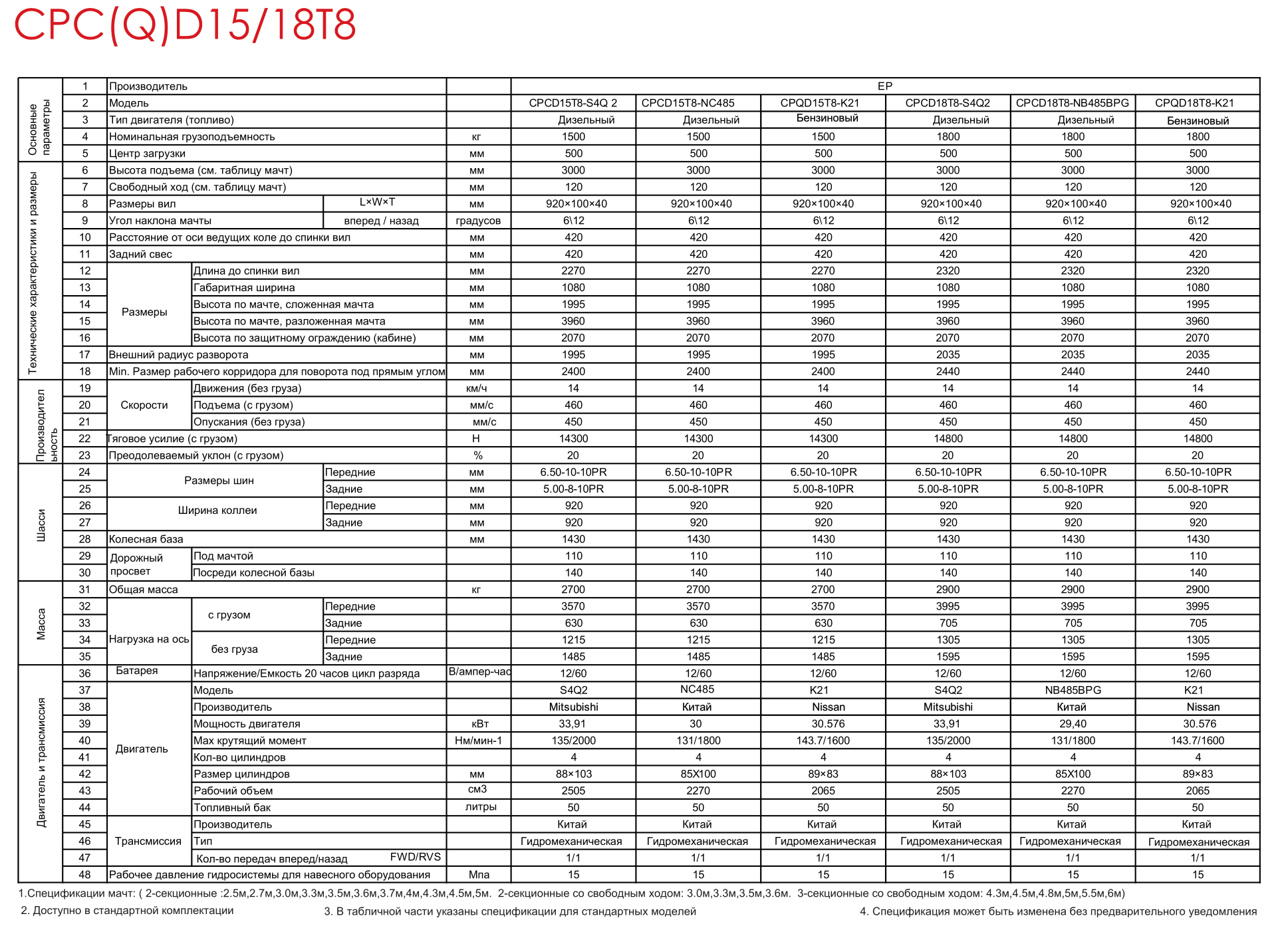 Продуманное управление, эргономичная кабина и современные системы безопасности обеспечивают комфорт и защиту оператора при интенсивной эксплуатации. EP CPCD15T8 – идеальный выбор для оптимизации складских процессов, повышения производительности и надежной поддержки вашего бизнеса.