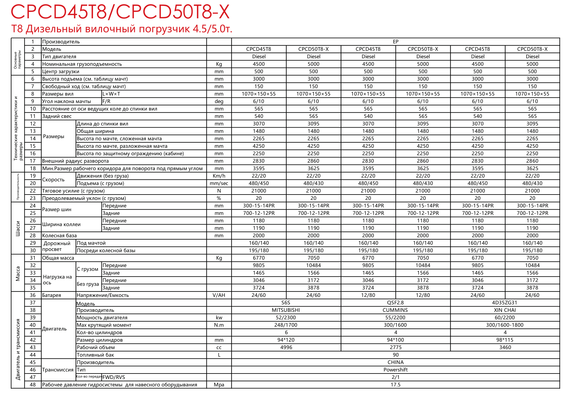 Точную комплектацию вилочного погрузчика уточняйте у нашего менеджера.Техника, может быть оснащена дополнительным оборудованием.Характеристики могут меняться в зависимости от комплектации.Дизельный вилочный погрузчик EP CPCD50T8-X от EP Equipment – это надежная, производительная и функциональная техника, предназначенная для эффективного перемещения грузов в различных отраслях промышленности и хозяйства.