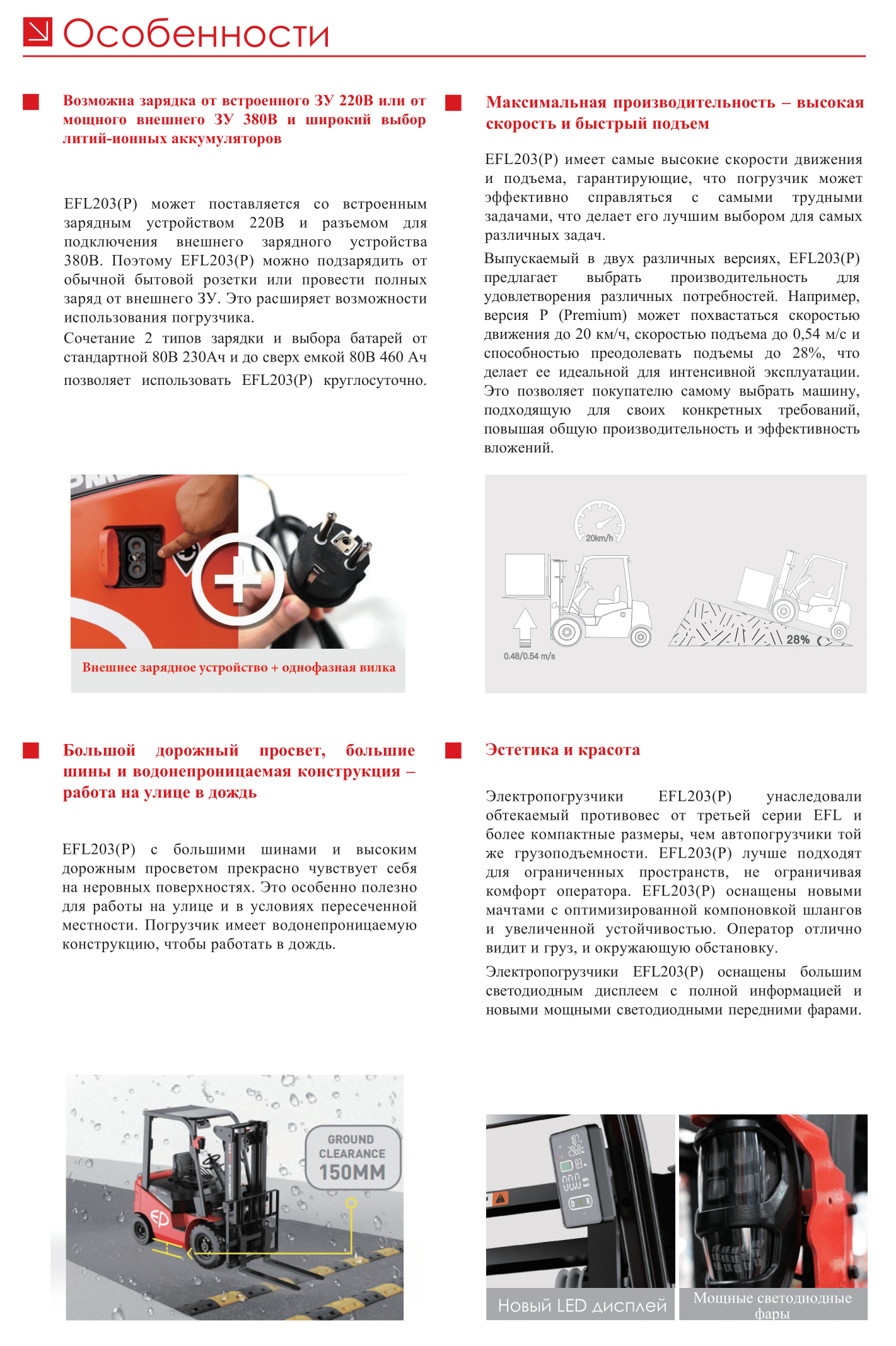 Электропогрузчик EP EFL203(P) сочетает в себе ряд преимуществ: большие колеса, высокий клиренс, водозащиту, просторное рабочее место оператора, высокую мощность, отсутствие выбросов, низкий уровень шума, быструю зарядку и экономичное обслуживание.