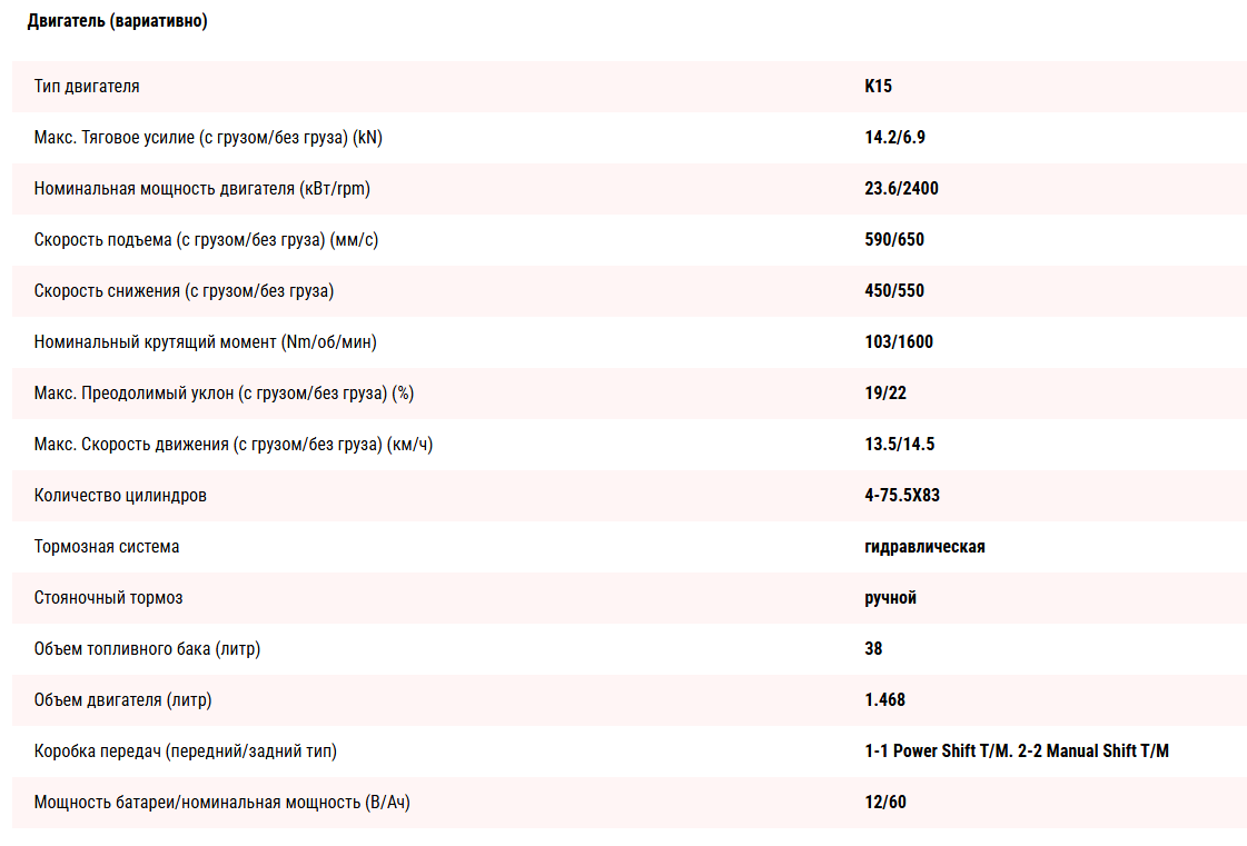 NissanМощный двигательОсновным преимуществом этого автопогрузчика является его двигатель K15 от компании Nissan. Он имеет мощность равную 36.5 л.с. Этого достаточно, чтобы поднять груз на высоту от 2 до 7 метров за минимальный промежуток времени, и обеспечить машине скорость движения с нагрузкой до 18 км/час.