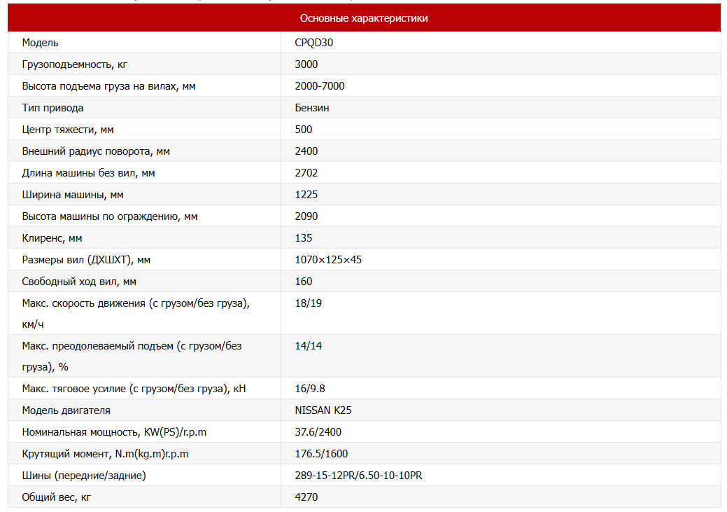 NissanCHL CPQD30 – универсальный бензиновый погрузчик с грузоподъемностью в 3 тонны и максимальной высотой подъема 6,5 метров.